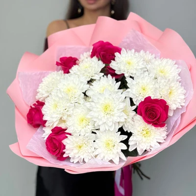 Роскошный букет из свежих белых хризантем и ярких малиновых роз — сочетание нежности и выразительной романтики. Цветы собраны в стильную упаковку нежно-розовых оттенков, благодаря чему букет выглядит воздушным, объёмным и по-настоящему праздничным.