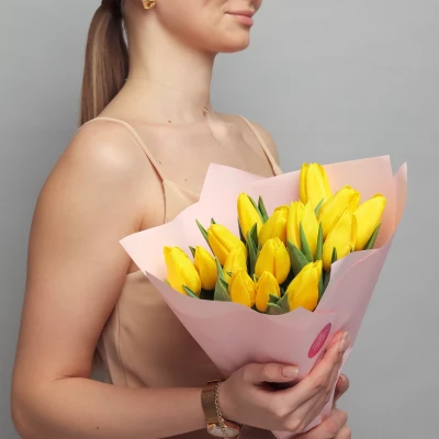 Яркий букет из 15 желтых тюльпанов в стильной упаковке.