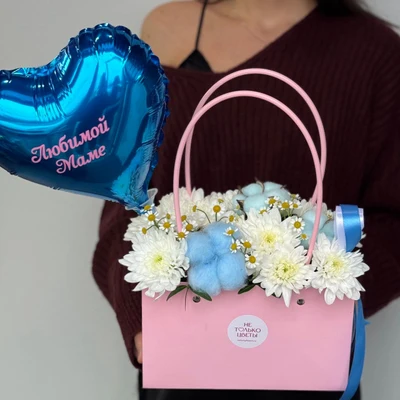 Этот букет с голубыми хризантемами и пушистым хлопком, создаст уютную атмосферу и подарит ощущение спокойствия. Идеален для подарка любимым - символ вашей заботы и нежности. Шарик может быть заменен на золотой. Размеры композиции: Высота - 38 см (с учетом шарика); Ширина - 22 см.