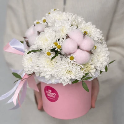 Нежная композиция в шляпной коробке из кустовой хризантемы с добавлением хлопка и матрикарии.