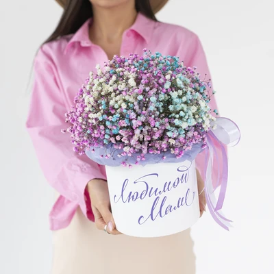 Композиция в шляпной коробке, составленная из пышной и ароматной гипсофилы в радужных цветах с надписью Любимой маме. Надписи может незначительно отличаться от фото. Цвет коробки может отличаться от фото