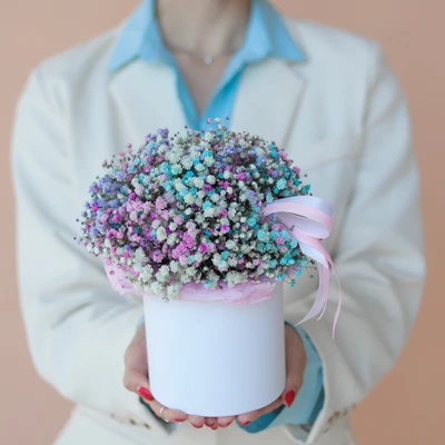 Нежная композиция из гипсофил в шляпной коробке Размер: Ширина: 18 см. Высота: 22 см.