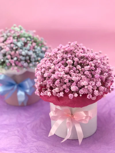 Шляпная коробка из гипсофилы, в розовом цвете. Цвет коробки может отличаться от фото. Размер: Ширина: 18 см. Высота: 22 см.